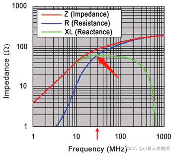 磁珠的阻抗为Z=R+JWL,下图所示,箭头处对应的频率称之为