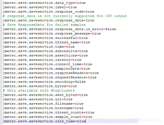同样在jmeter的bin目录下找到jmeter.properties中,设置需要输出的内容为true,并去掉前面的注释符号#,这里全部设置成true→保存