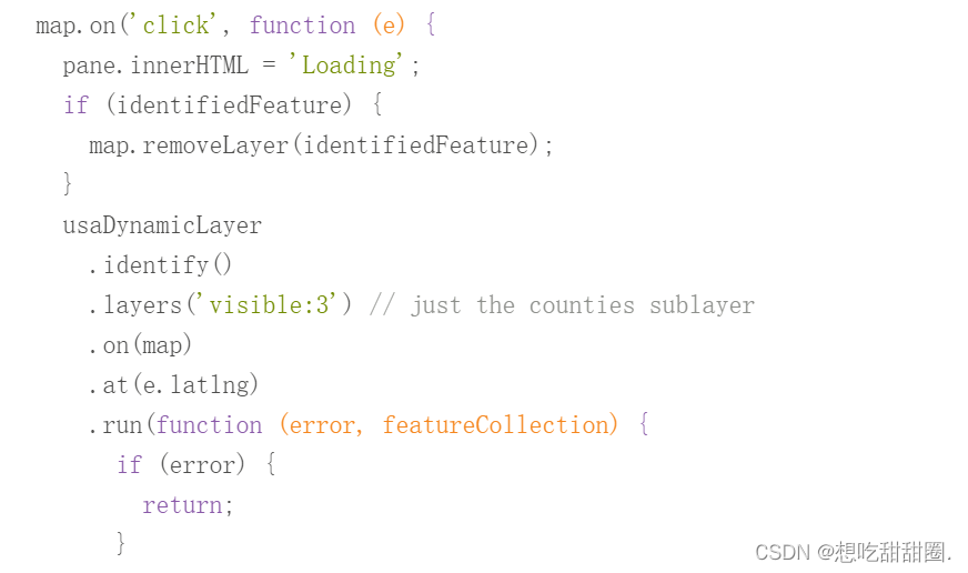 identify():新的L.esri服务。查找可用于查找特征的对象。你的回调函数将传递带有结果过错误的GeoJson