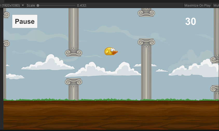47、运行场景,就会自动生成场景,点击 Game ,开始游戏,Pause 暂停游戏,Bird 撞地面和管子都会游戏结束,每过一个管子都会增加分数