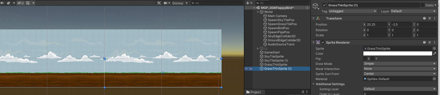 7、把天空和草地作为预制体,其中图片显示层级做修改,SkyTile 的 Order in Layer 为 -5(显示在后面),GrassTile 的 Order in Layer 为 5(显示在前面面),两个添加 Rigidbody2D ,其中 Rigidbody2D 的 Body Type 设置为 Kinematic(不会有向下的重力,但是可以施加 Rigidbody2D.velocity 的速度效果),然后 拖到 Resources 作为预制体
