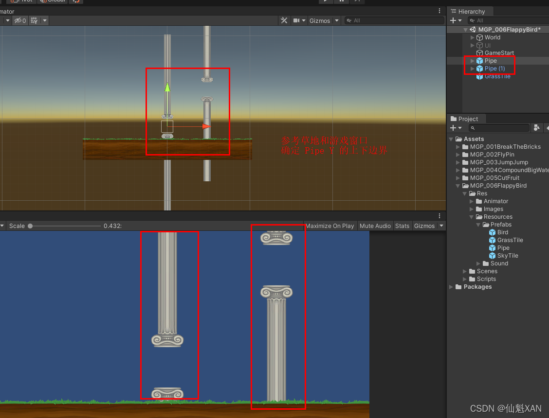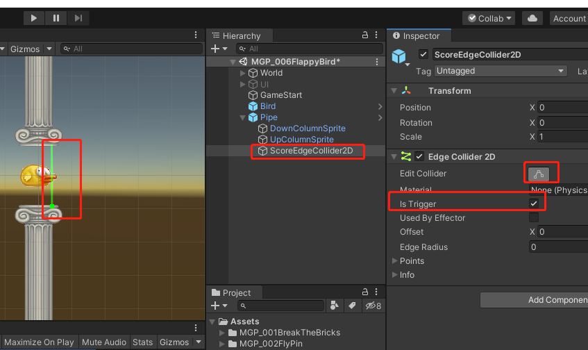 15、把管子拖入场景,把 Bird 拖入场景中,为了适配鸟过去,添加一个空物体GameObject,改名为 Pipe(添加 Rigidbody2D,BodyType 设置为 Kinematic),把管子图片置于其下,上下一个,位置如下,DownColumnSprite 的 Pos(0,-6,0),BoxCollider2D 适配精灵图实际大小,UpColumnSprite的 Pos(0,6,0),BoxCollider2D 适配精灵图实际大小,ScoreEdgeCollider2D 位置和方向如图,刚好鸟在中间触发加分,并勾选 IsTrigger (可以碰撞触发,但没有实际碰撞效果)
