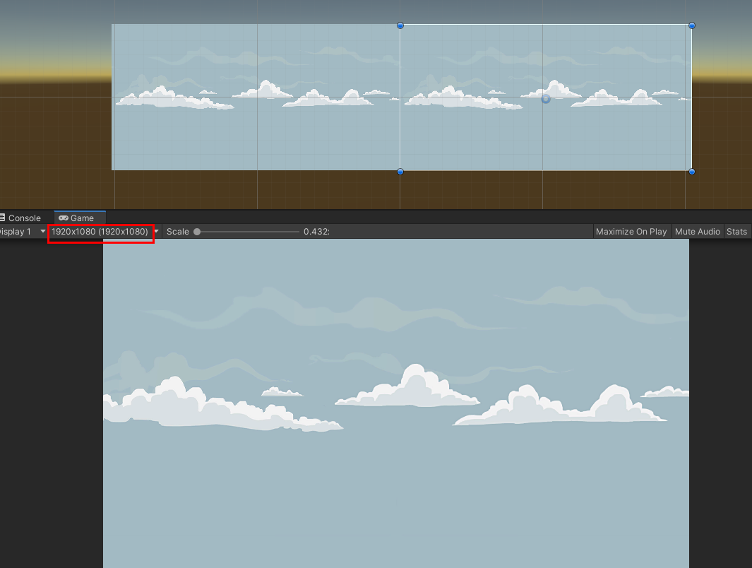 4、把两张天空图拖入场景,左右拼接两张图,一个pos(0,0,0),另一个pos(20.25,0,0),20.25很关键,将作为循环背景移动的关键参考数据