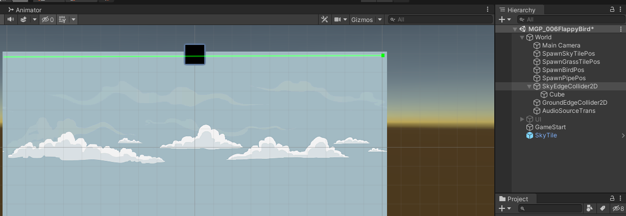 19、 在 World 下添加一个 GameObject ,添加 EdgeCollider2D ,改名为 SkyEdgeCollider2D ,添加一个Cube 作为可视化参考,位置搞好放置到天空上(拖入天空预制体作为参考),如图