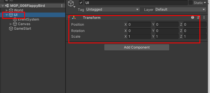 20、新建一个 GameObject,改名为UI,用来当作 UI相关部分的父物体,pos 为 (0,0,0)