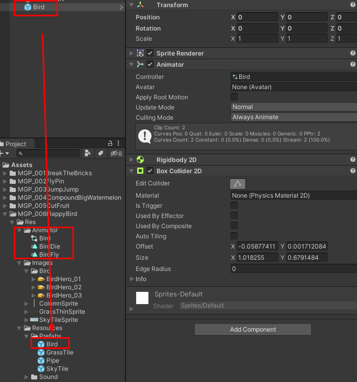 14、这样 Bird 的动画机完成了,整理一下相关资源,在 Bird 上,添加 Rigidbody ,和 BoxCollider2D,并整理BoxCollider2D大小适配鸟实际大小,然后把 Bird 拖入 Resources 作为预制体资源