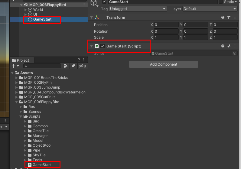 46、在场景中添加 GameObject 空物体,改名为 GameStart,并且挂载 GameStart 脚本