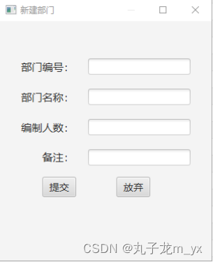 DeptDialogView.fxml,该视图既有新建部门的功能,又有更新部门的功能,如果是新建部门的话,输入框为空;如果是更新部门的话输入框回显部门信息。