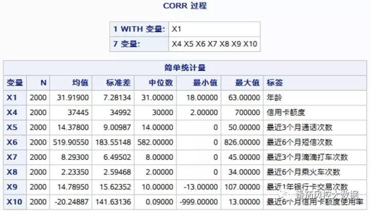 X10均为连续型变量,我们通过SAS中的corr过程步分析变量X4
