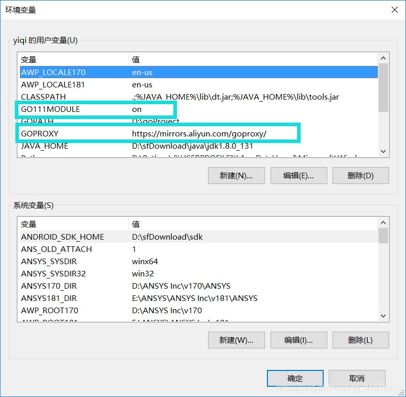 Windows在电脑 -> 系统 -> 高级系统设置 -> 用户环境中分别新建GO111MODULE和GOPROXY两个用户变量,其值如下图所示: