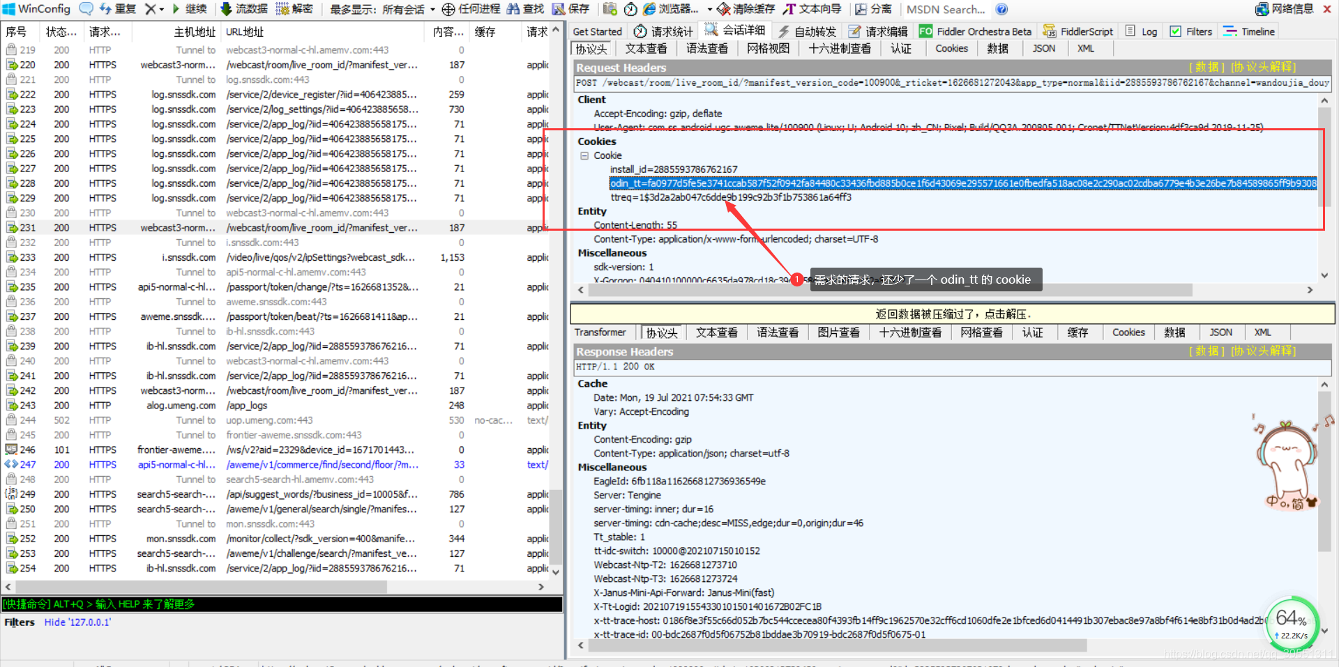 对比需求的请求的包,发现cookie还多了 一个 odin_tt 的参数