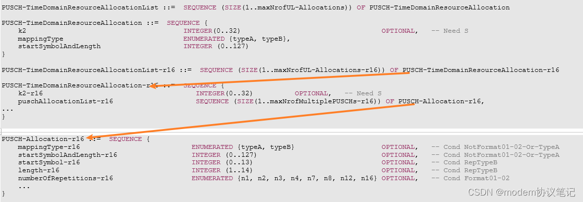 R16 针对DCI 0_1/0_2 增加了PUSCH-TimeDomainResourceAllocationList-r16,可以在K2相同的情况下,定义S和L的不同情况,增加了调度的灵活性,配置结构如上。