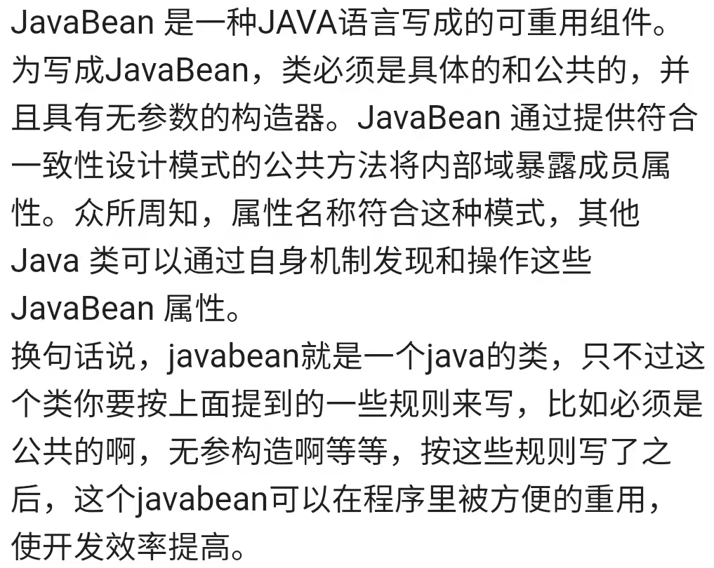 javabean是一种特殊的jiava类,不过这个类要按照一些规则来写,就比如要有无参的构造函数,