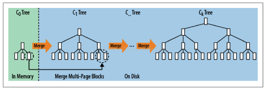 当内存中树的数据达到阀值时,会进行合并操作。合并操作会从左至右遍历内存中的叶子节点与磁盘中树的叶子节点进行合并,当合并的数据量达到磁盘的存储页的大小时,会将合并的数据持久化到磁盘。同时更新父亲节点对叶子节点的指针。