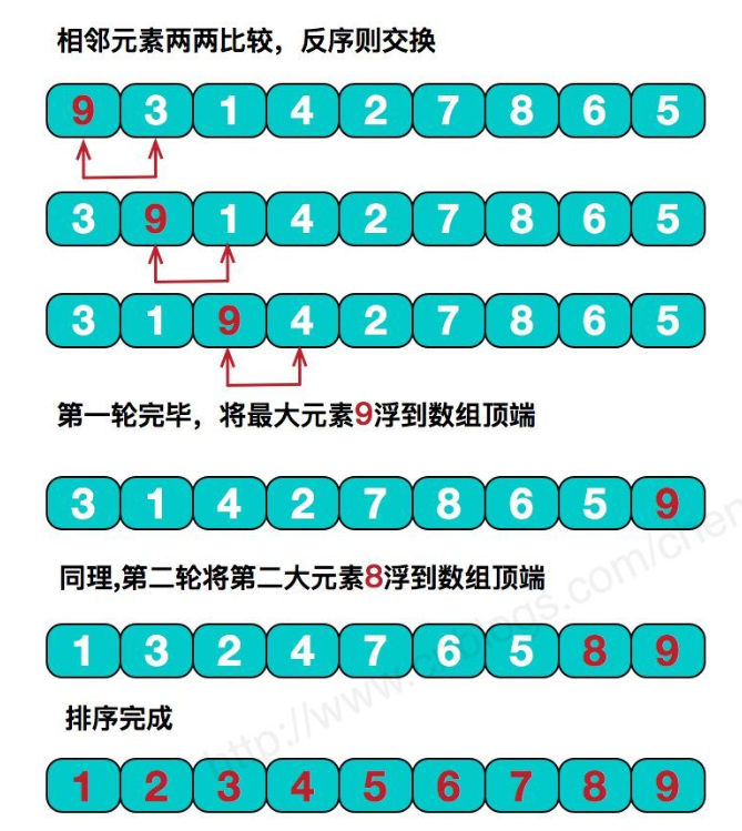 依次比较相邻的两个数,将小数放在前面,大数放在后面。