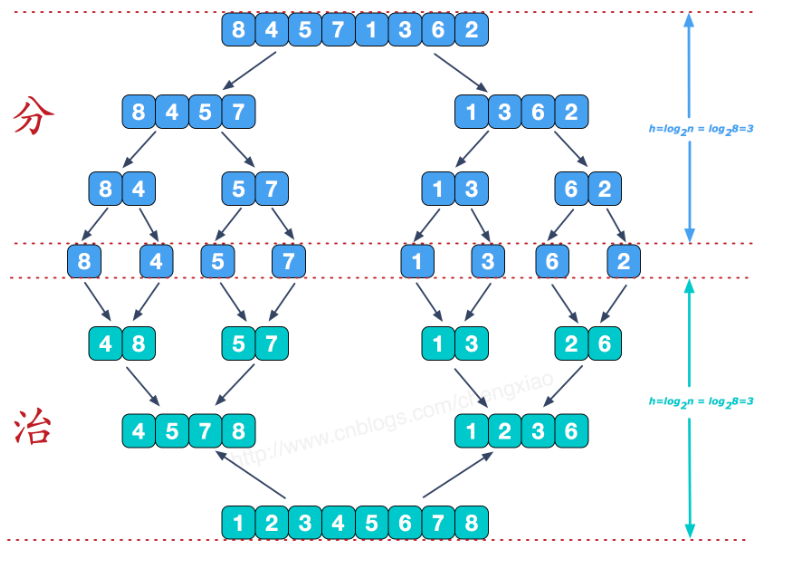 归并排序(MERGE-SORT)是利用归并的思想实现的排序方法,该算法采用经典的分治(divide-and-conquer)策略(分治法将问题分(divide)成一些小的问题然后递归求解,而治(conquer)的阶段则将分的阶段得到的各答案”修补”在一起,即分而治之)。