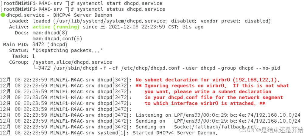 现在可以开启dhcp服务,如果没有报错,则说明配置正确