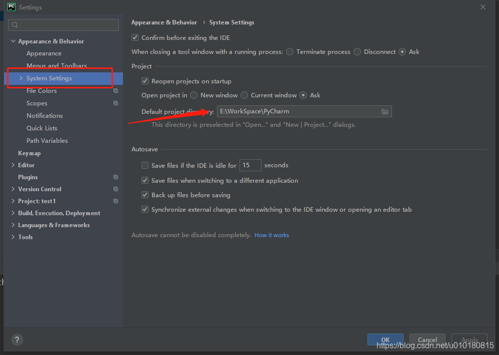 Pycharm修改项目默认路径的方法: