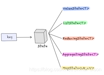 每一个key对应有一个State,这个State可不简单。它的存储结构是非常丰富的。Flink官方把这些结构的操作称之为针对Keyed State的primitive(原语)。后边,我们也使用这个词来描述。