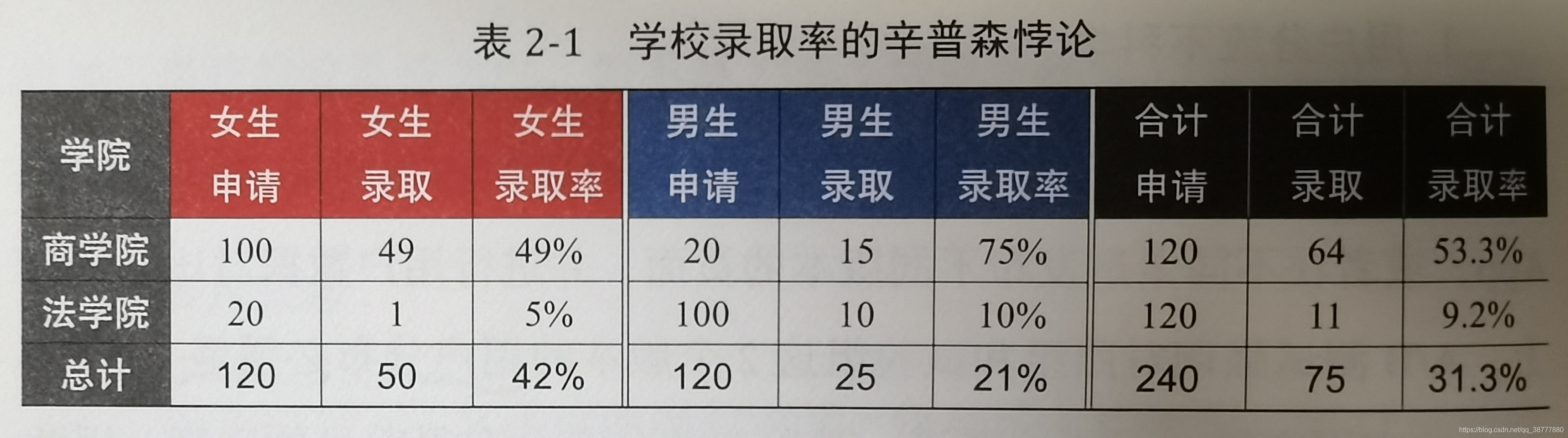 为什么两个学院都是男生录取率高于女生录取率, 但是总人数加起来后男生录取率却不如女生录取率呢? 主要是因为这两个学院男女比例很不一样, 具体的统计学原理我们在后面的章节中会详细介绍。