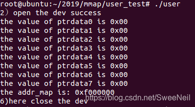以上是内核部分,主要是创建一个字符设备,配置其mmap函数,分配连续内存。分配了4pages,并将首地址开始初始化了8bytes。