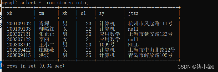 (200109102,"肖辉","男",23,"计算机","杭州市凤起路111号"),