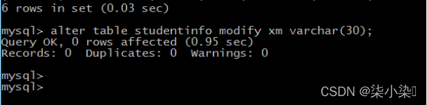 (4)将 studentinfo 表的xm字段的数据类型改为 VARCHAR(30)。