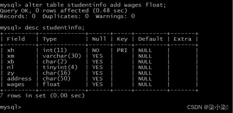 (6)在 studentinfo 表中增加名为wages的字段,数据类型为FLOAT。