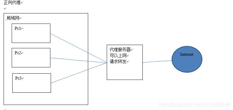 说到反向代理,先说说正向代理是什么,正向代理就是,假如现在有三台电脑,上不了网,但是有一台代理服务器可以上网,这时候这三台电脑就可以跟这个代理服务器进行配置,需要一个软件,配置好之后就可以上网了,pc1比如要访问百度,它会先把这个请求发送给代理服务器,然后代理服务器去访问百度,百度把回馈信息发送给代理服务器,然后再交给pc1