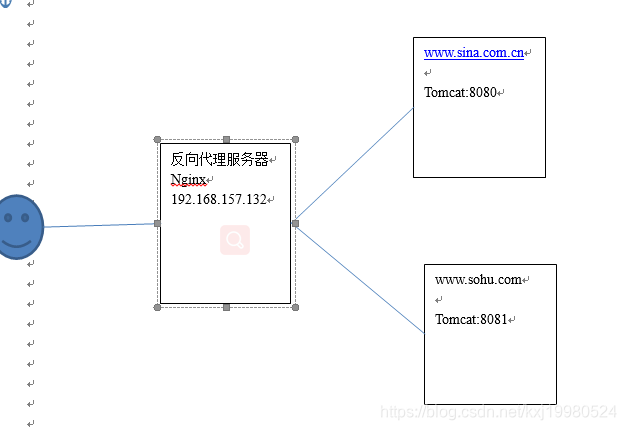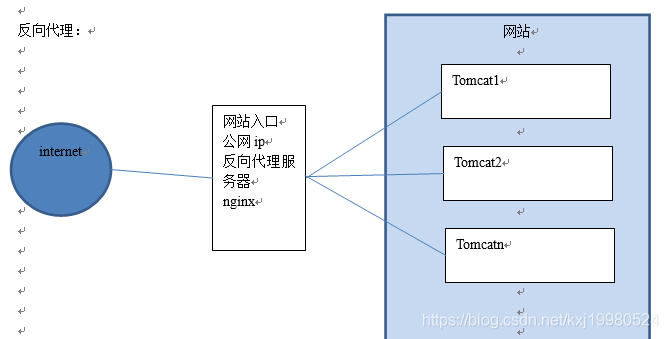 反向代理是,假设我公司开发了三个软件,但是只买了一个公网ip,三个软件部署在三个tomcat上,之前说到一个域名只对应一个ip,一个ip可以对应多个域名,所以这三个软件都绑定的这一个ip,现在用户要通过公网ip来访问我这三个软件其中的一个,这时候,nginx起到反向代理的作用,它根据域名的不同,来把请求转发到对应的应用服务器tomcat上,tomcat把返回结果给nginx然后再回馈给用户.