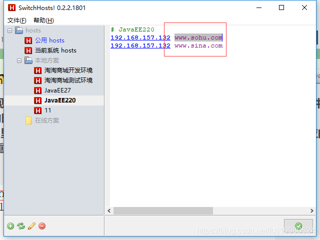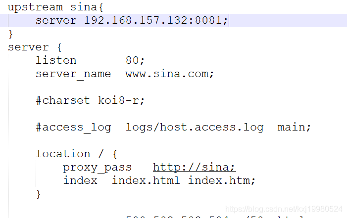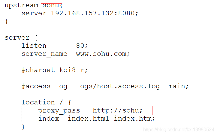 这个测试成功后,现在需要通过nginx,通过域名的不同来进行访问,配置nginx配置文件,配置文件的意思就是当请求来的时候,先访问nginx的www.sohu.com,找到这个后它会找它对应的location,location里面配置的是sohu,它会找对应的upstream sohu然后找里面对应的路径,进行访问.修改完后保存重新加载nginx,进行测试.
