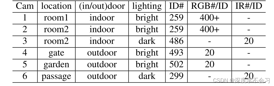 包括来自 6 个摄像头的 491 个身份的 RGB 和 IR 图像,总共提供 287,628 个 RGB 图像和 15,792 张红外图像。包括两个红外线摄像机和四个RGB摄像机,利用Kinect V1在两个明亮的室内(房间1和房间2)采集相机1和相机2的RGB图像。对于每个人,至少有400个具有不同姿态和视点的连续RGB帧。摄像机3和摄像机6的IR图像在黑暗中由IR摄像机捕获,摄像机3放置在暗环境中的房间2中,而摄像机6放置在具有背景杂波的室外通道中。摄像机4和5是放置在两个室外场景中的RGB监视摄像机。