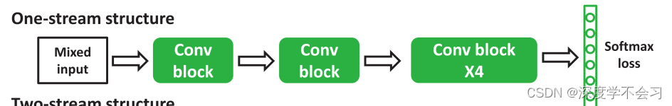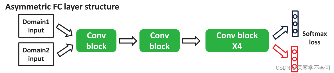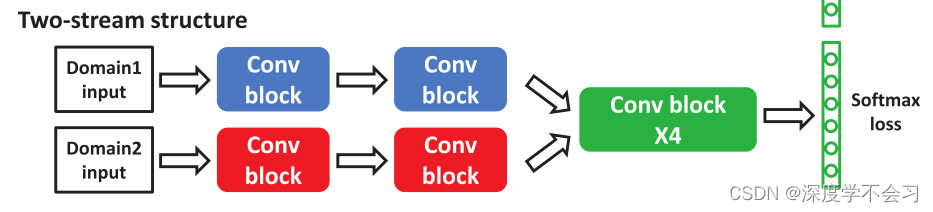 有两个输入,对应于两个不同域中的数据。在较浅的层中,网络的参数是针对每个域的。在较深的层中,使用共享参数。与单流结构相比,双流结构实现了两件事: