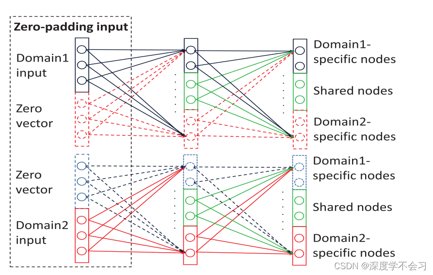 在每一层中,蓝色节点表示域1特定的节点,红色节点表示域2特定的节点,绿色节点表示共享节点,虚线节点表示零值。