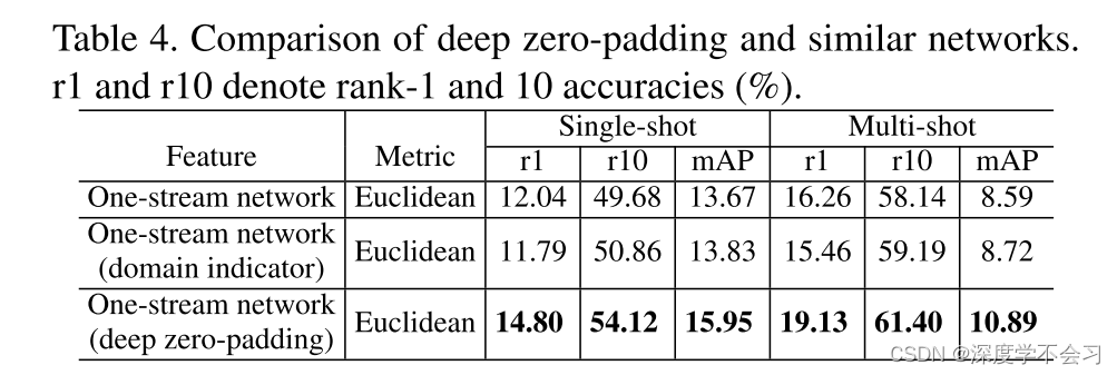 单流网络可以在存在域指示符的情况下作为两流网络工作。因此,我们将两个额外的通道填充到输入图像中,作为域指示器。对于RGB图像,第一通道用等于255的所有像素填充,第二通道用0填充,而对于IR图像,第一通道用0填充,第二通道用255填充。此填充过程向网络明确提供了域指示符, 提出的深度零填充方法达到了最佳性能。具有域指示符的输入仅实现与原始单流网络性能相似的性能。性能比较如表所示: