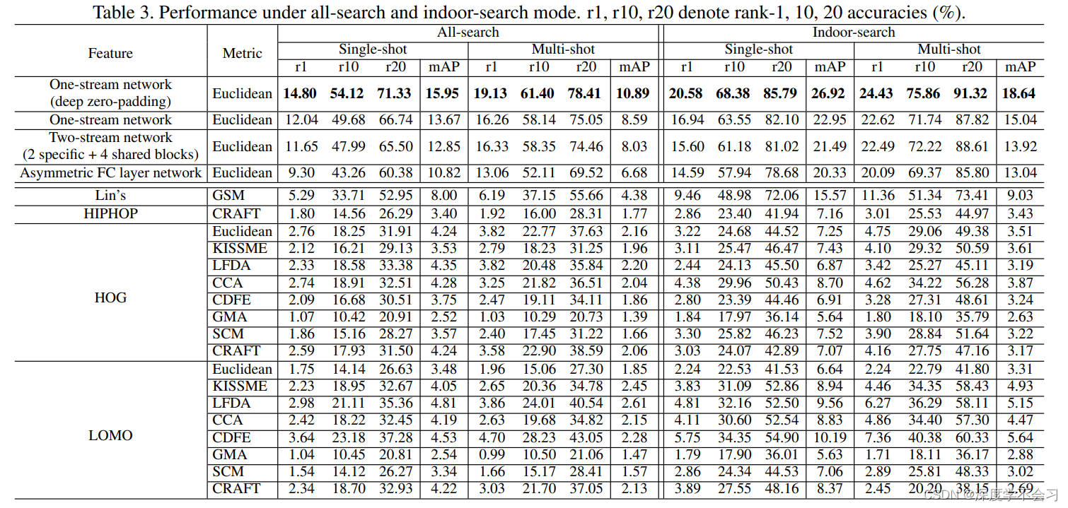 可以看到深度零填充优于双流网络和非对称 FC 层结构。 以单次设置下的全搜索模式下的rank-1准确率为例,深度零填充与双流/非对称FC层之间的差距为3.15%/5.50%。