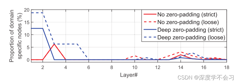 域特定节点的比例与层深度的关系。x轴表示从网络底部到顶部的层深度,y轴表示域特定节点的比例。严格阈值T=0.01 std (x (l) i),松散阈值T=0.05 std (x (l) i), (std (x (l) i) 是第i层节点输出的标准差)。一般而言,使用深度零填充的域特定节点的比例高于不使用零填充的域特定节点的比例。