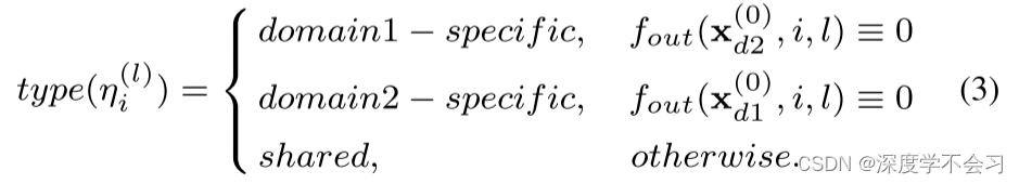 假设2:如图所示,对于处理两个域的输入的单流网络,我们将每层的输出节点分为三种类型:域1特定节点、域2特定节点和共享节点。分类取决于节点的响应是否特定于域。设x(l)d1和x(l)d2分别表示域1和域2的层l+1的输入。例如,x(0)d1和x(0)d2是整个网络的输入。设η(l)i表示层l中的第i个节点,fout(x(0),i,l)表示η(l)i与网络输入x(0)的输出,可以得到
