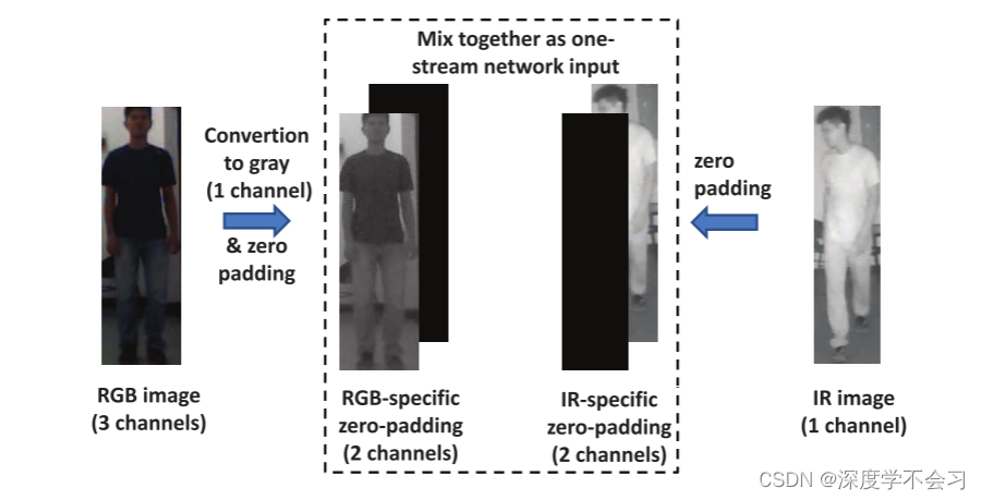 RGB-IR跨模态识别中,一个通道对应于卷积神经网络FC层的一个节点。对于图像,在通道级别执行零填充。如图所示,RGB图像被转换为灰度图像并放置在第一个通道中,然后零填充图像被放置在第二个通道中。对于红外图像,它被放置在第二个通道中,零填充图像被放置在第一个通道中。