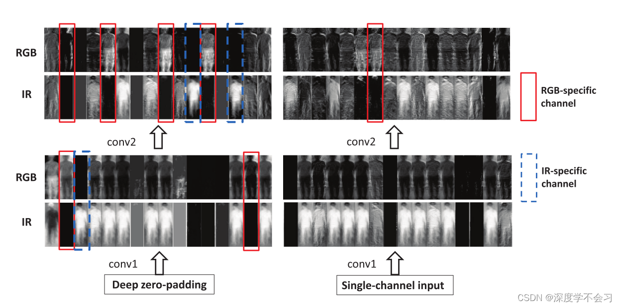 具有深零填充和单通道输入的ResNet-6的第一和第二卷积层的特征图。在每一层中,第一行显示RGB输入的特征图,第二行显示IR输入的特征图。很明显,通过深零填充学习的左侧域特定通道比通过单通道输入学习的通道要多得多。