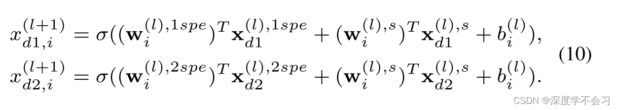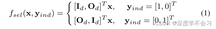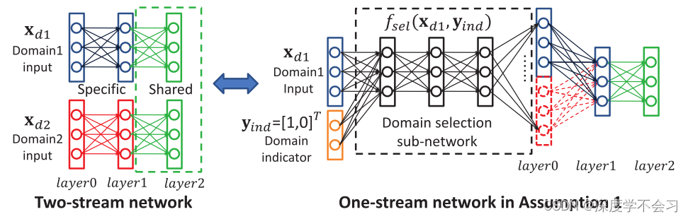 右边是单流网络,它可以有条件地等效于前向传播中的两个流,X其中有一个域选择子网络用于选择以下域特定结构。我们首先定义一些符号用于说X明。令Xd1 ∈ Rd和Xd2 ∈ Rd分别表示domain1和domain2的输入。我们将域指示符yind1定义为具有两个元素的向量,其值分别为 [1,0] T或 [0,1] T,表示域1或域2。令fsel(x,yind) 表示域选择子网络,实现以下功能: