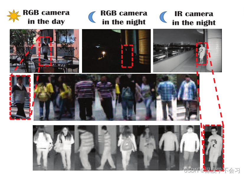 由于大多数监控摄像机能够在黑暗中自动从RGB模式切换到IR模式。 分别在白天和夜间在两个室外场景中捕获的RGB图像和红外(IR)图像的示例。每两列中的图像都是同一个人的。由接收不同波长光的设备捕获,同一个人的RGB图像和红外图像看起来非常不同。