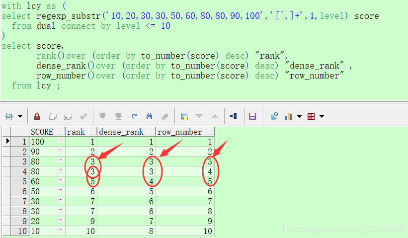 dense_rank()over (order by to_number(score) desc) "dense_rank" ,