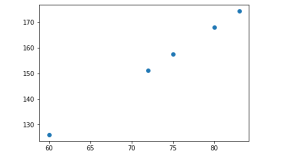 plt.scatter([60,72,75,80,83],[126,151.2,157.5,168,174.3])#散点图