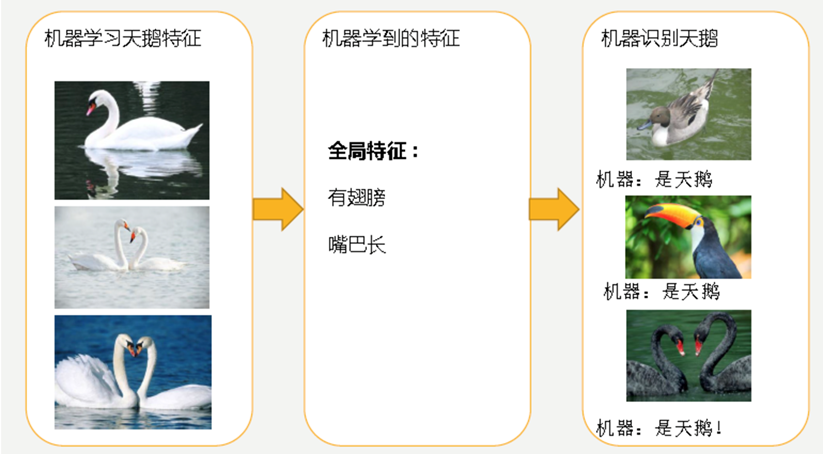 经过训练后,知道了天鹅是有翅膀的,天鹅的嘴巴是长长的。简单的认为有这些特征的都是天鹅。因为机器学习到的