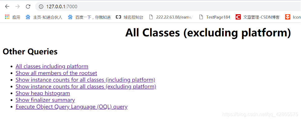 C:\Users\Van> jhat -J-Xmx512m G:\heap.bin Reading from G:\heap.bin... Dump file created Sun Jul 21 17:42:16 CST 2019 Snapshot read, resolving... Resolving 7939 objects... Chasing references, expect 1 dots. Eliminating duplicate references. Snapshot resolved. Started HTTP server on port 7000 Server is ready.