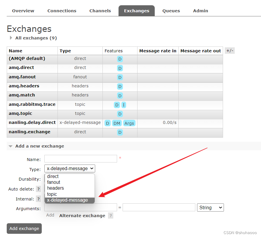 此时进入RabbitMQ管理页面可以看到能选择该类型,代表安装成功