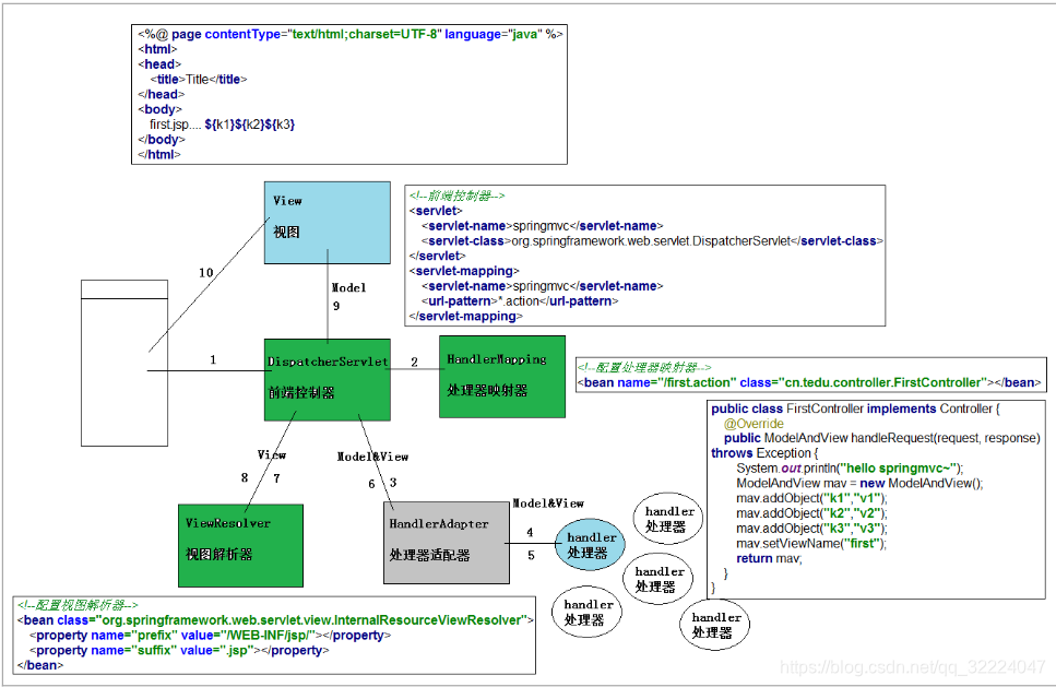 前端控制器不处理请求,只做中转,它相当于一个中转站,所有的访问都会走到这个Servlet中,再根据配置进行中转到相应的Handler中进行处理,获取到数据和视图后,在使用相应视图做出响应。