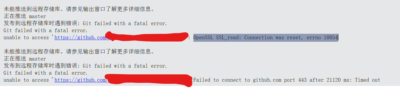 在用vs推送代码到github上的时候,出现错误;OpenSSL SSL_read: Connection was reset, errno 10054