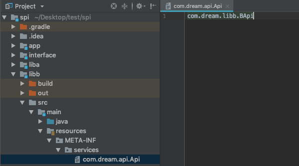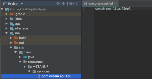 实现A的对应库Jar包中需要在META-INF/services下放入名称为接口Api完整类名的文件,并填入对应实现类名(如Jar包内有多个实现,则用换行进行分隔),如下所示: